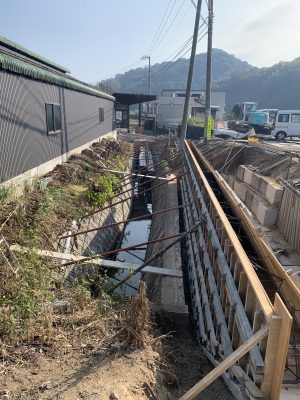 工程を進めていくためにトウフ(コンクリートの塊)や矢板を用いて